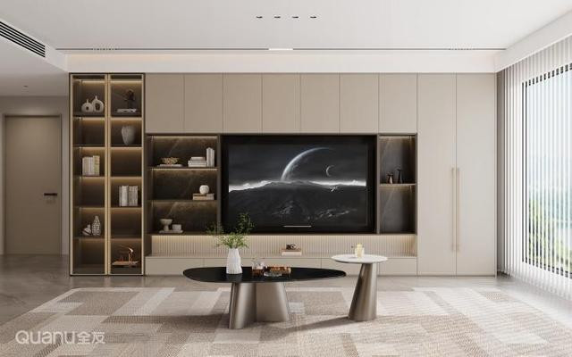①电视柜兼具收纳与展示功能,风铃灰门板高级简约,搭配古铜拉手,彰显不凡格调