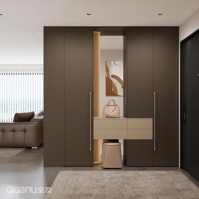 ②玄关与沙发柜做L型一体设计,通过进退、穿插、阵列等艺术手法,营造动态美感